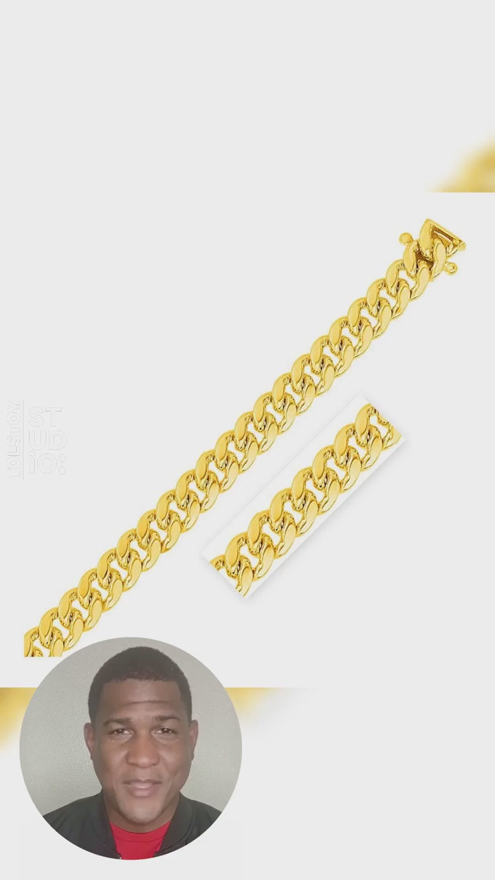This classic Miami cuban solid chain comes in 14k yellow gold and has a width of 10.0 millimeters.